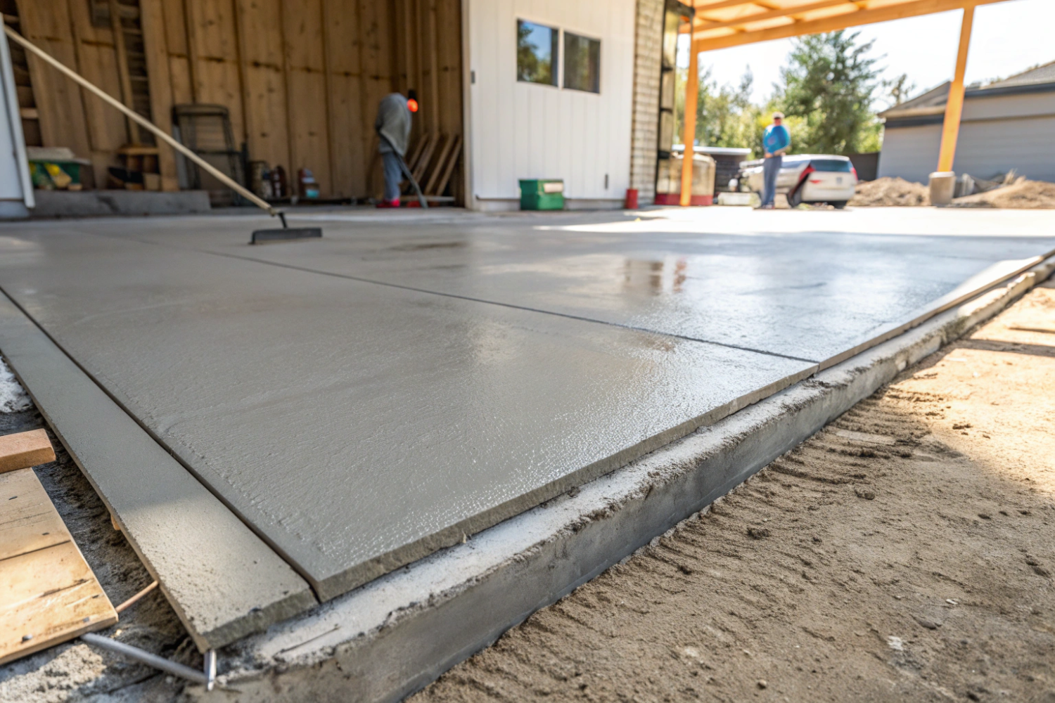 - Concrete pour and finishing — Concrete is poured, screeded level, and finished to a surface appropriate for the intended use — broom finish for grip, steel trowel where a smoother floor is needed.