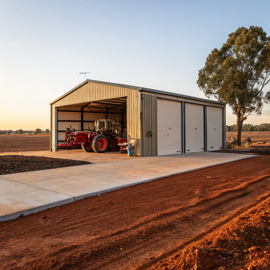 For light-duty applications — standard garden storage sheds and small backyard structures — a 100mm slab with reinforcement mesh is typically adequate for the loads involved. Step up to a home workshop or vehicle storage shed, and you’re generally looking at 100–125mm with heavier mesh or bar reinforcement to handle machinery, equipment, and vehicle weight. Heavy-duty rural and commercial shed slabs — carrying tractors, forklifts, loaded racking systems, or significant point loads — are typically specified at 150mm or above with engineered steel reinforcement.